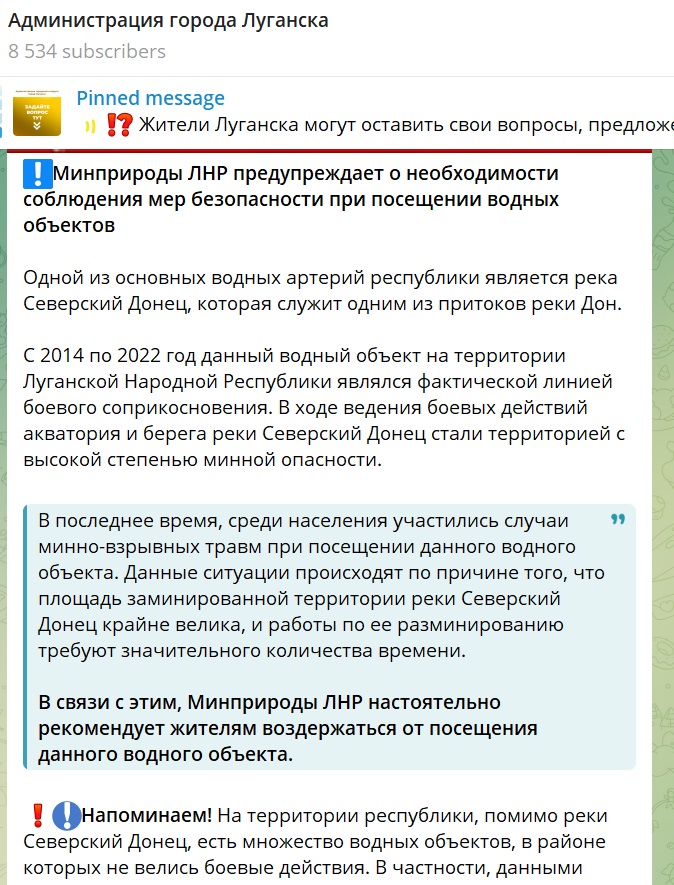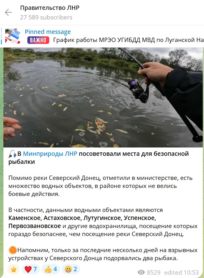 Замість того, щоб розмінувати територію, "уряд ЛНР" та "мінприроди ЛНР" радять рибалити в інших місцях, у яких, до речі, теж періодично підриваються на мінах. Повідомлення від 5 грудня 2025 року