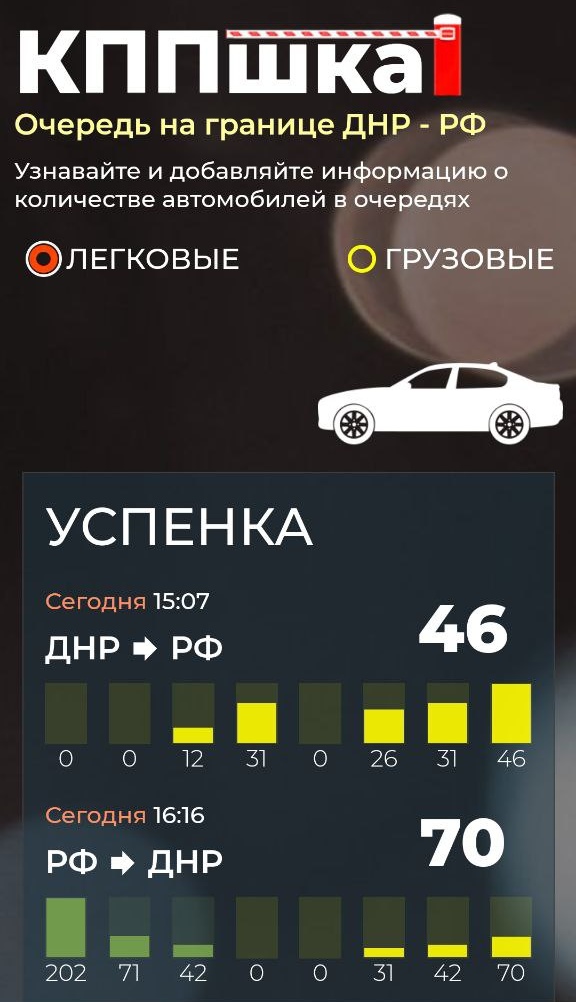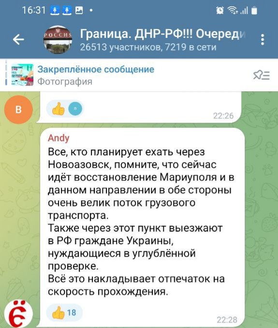 Отже, після акту "приєднання" "ДНР" до РФ слово "кордон" замінили на "контрольно-пропускний пункт", але для людей, які перетинають КПП, насправді нічого не змінилося. Вони змушені стояти у чергах та проходити паспортний контроль, як і до "возз'єднання". І як надовго можна застрягти на лінії розмежування, нікому не відомо. Ті, хто часто здійснює поїздки до Росії та назад, створили групу, де поділяються інформацією про ситуацію на тому чи іншому пункті пропуску.