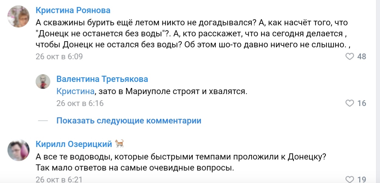 Новий водовід, як нам розповіли, має інше призначення. Він має забезпечити систему теплопостачання "республіки". "Ми вже практично закінчили проектно-кошторисну документацію на будівництво нового водоводу з Вуглегірського водосховища. Це дозволить нам вийти на новий рівень забезпечення водою. Це далеко ще від того режиму, за яким ми скучили, проте це дозволить заживити систему для теплопостачання", - розповів Пушилін в ефірі Першого телеканалу. Але люди, які не відчули покращень після введення в експлуатацію першого водоводу, критично сприйняли і будівництво нового.