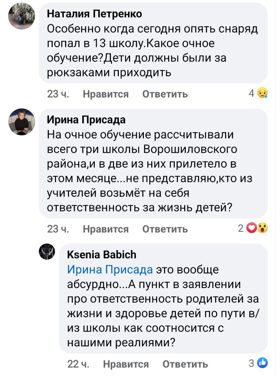 "Не віримо! Жодного вільного вибору "з урахуванням особистої думки" нам не дозволять зробити", - писали батьки у шкільних чатах. Багатьох захльостують емоції від спущених зверху вказівок. Вони дивуються, як можна відправити дитину до школи, коли їм самим іноді з дому вийти страшно. Деякі батьки у коментарях під постом Пушиліна писали, що запасних дітей вони не мають.