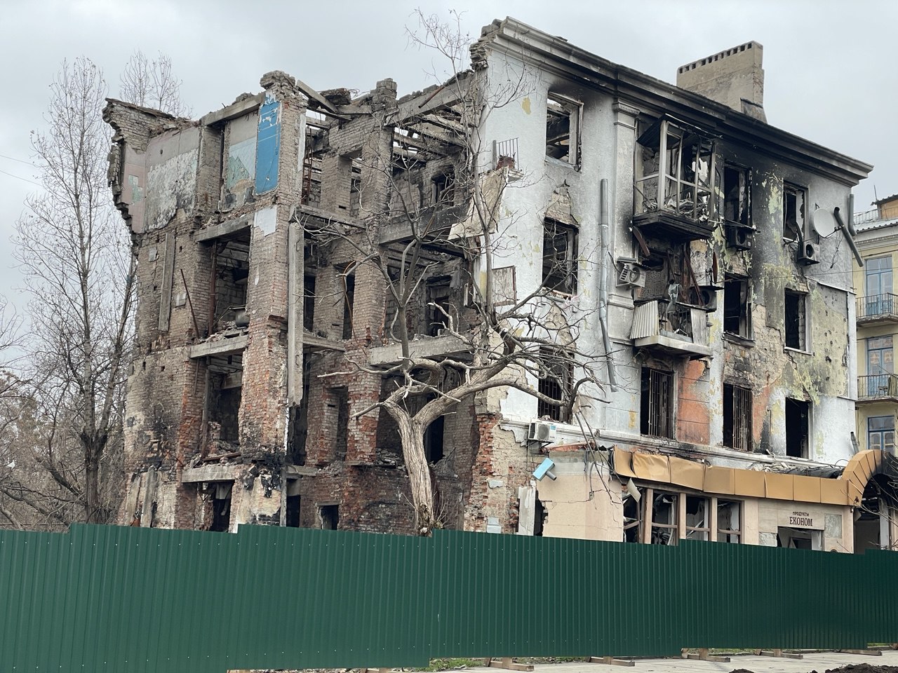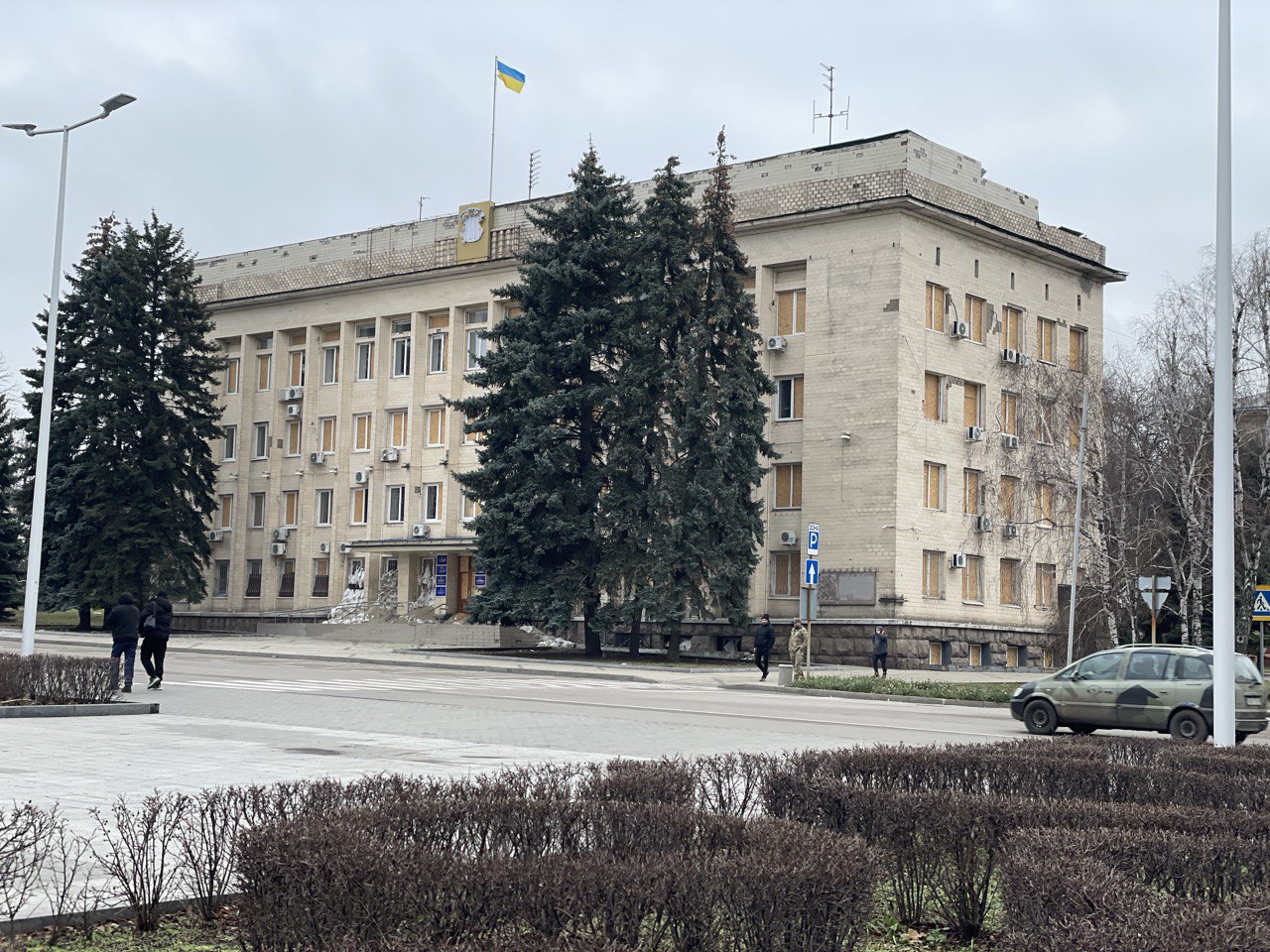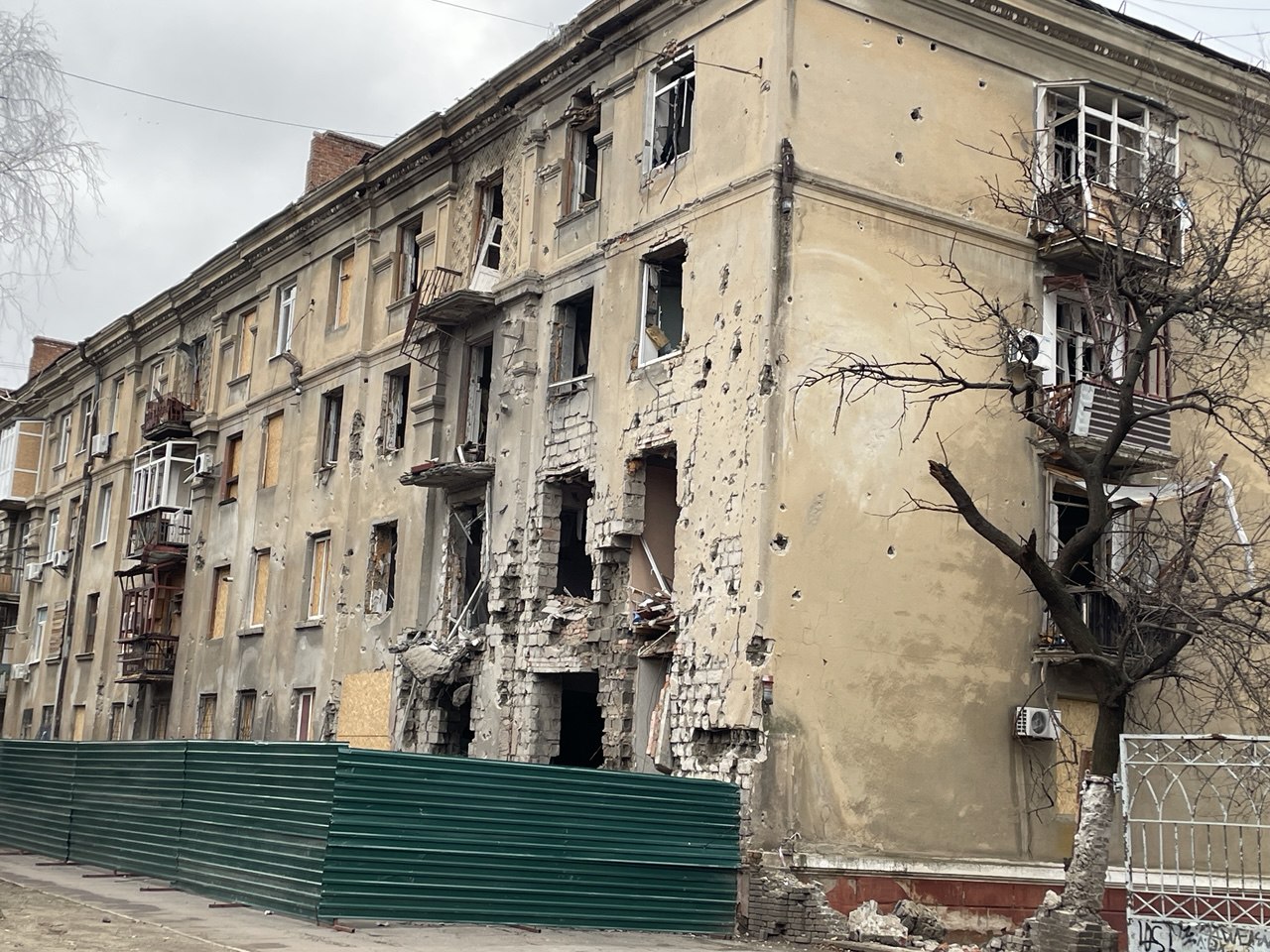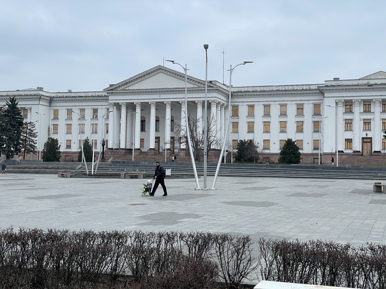 Вдень присутність війни помітна більше, ніж це бачилося у світлі ліхтарів. Окрім фонових бахів артилерії, вздовж доріг стоять розбиті будинки. Логіку вибору об'єктів атаки зрозуміти важко. Наприклад, не держадміністрація, а будинки біля неї. Або будівля Торгово-промислової палати. Або просто житлові будинки.