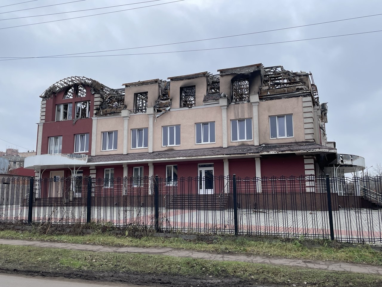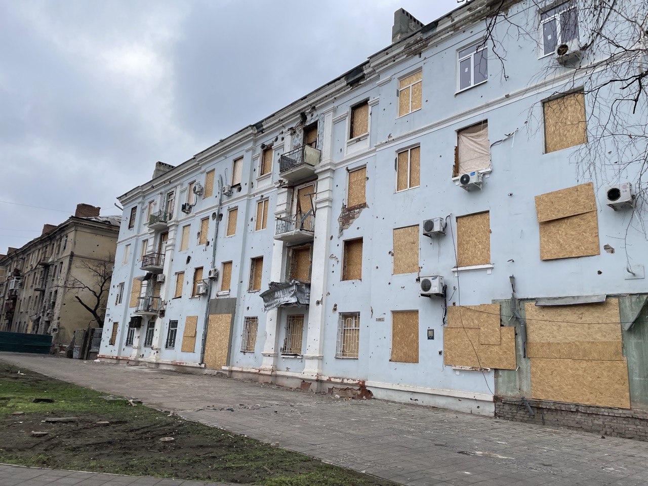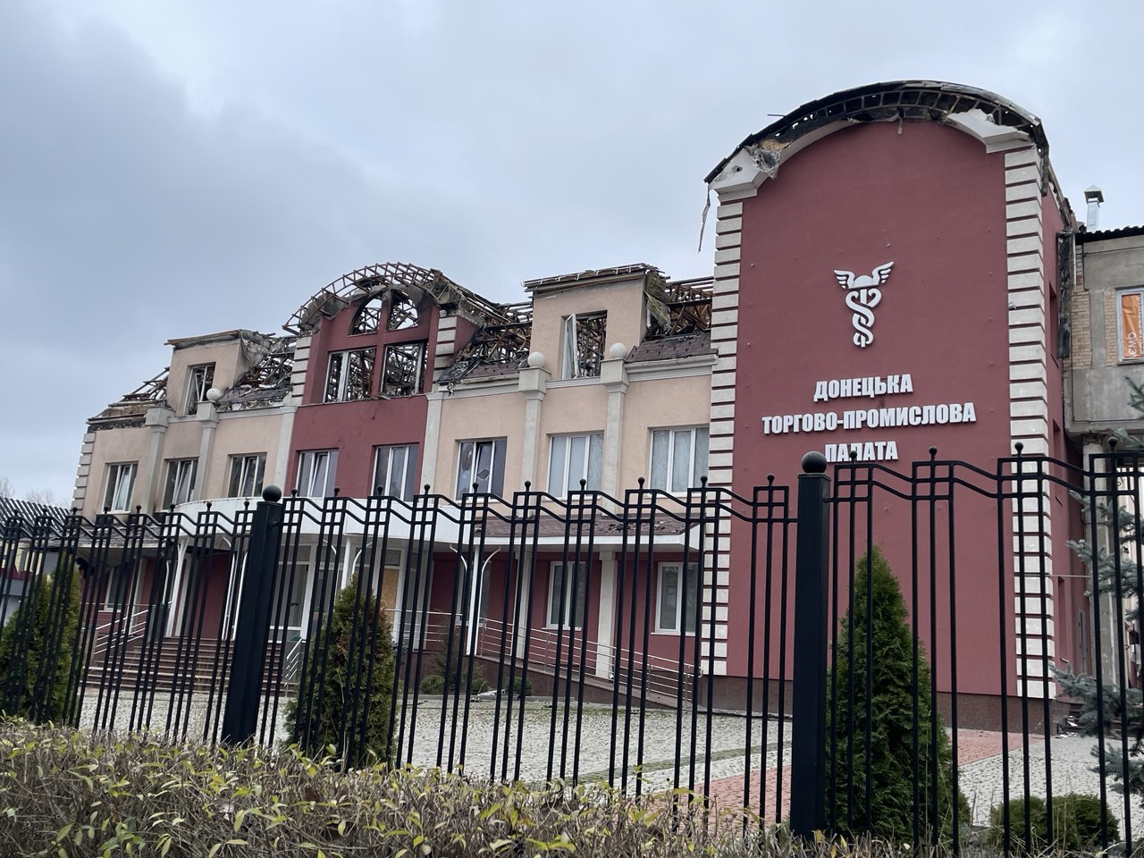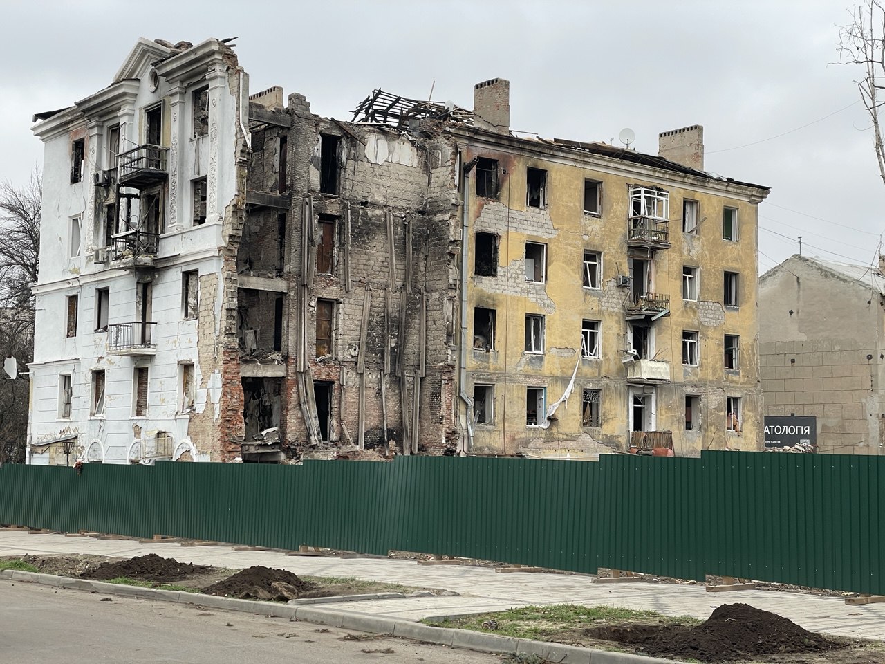 Вдень присутність війни помітна більше, ніж це бачилося у світлі ліхтарів. Окрім фонових бахів артилерії, вздовж доріг стоять розбиті будинки. Логіку вибору об'єктів атаки зрозуміти важко. Наприклад, не держадміністрація, а будинки біля неї. Або будівля Торгово-промислової палати. Або просто житлові будинки.