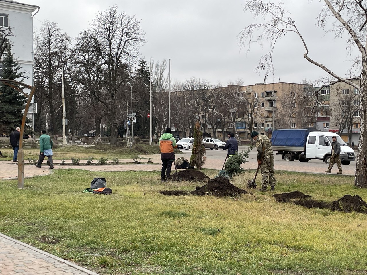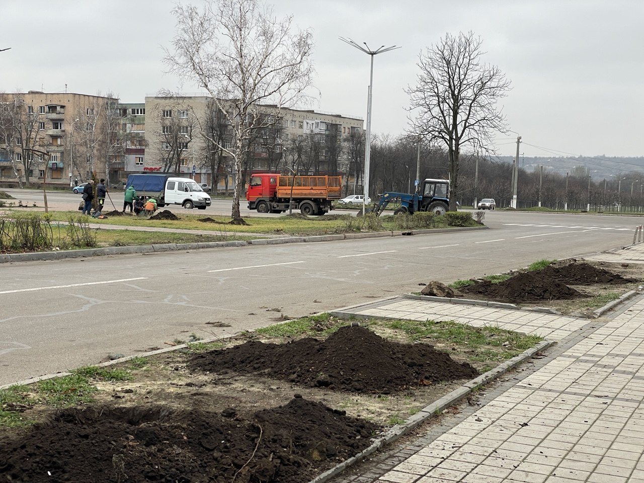 Водночас, поряд із цими будинками, на газонах, де росли знищені вибухами дерева, накопані ями, комунальники садять ялинки.