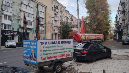 В окупованому Донецьку з'явилося авто з «націленою на Вашингтон» гумовою ракетою, вимогами позбавити Україну незалежності та ідеєю відродження СРСР