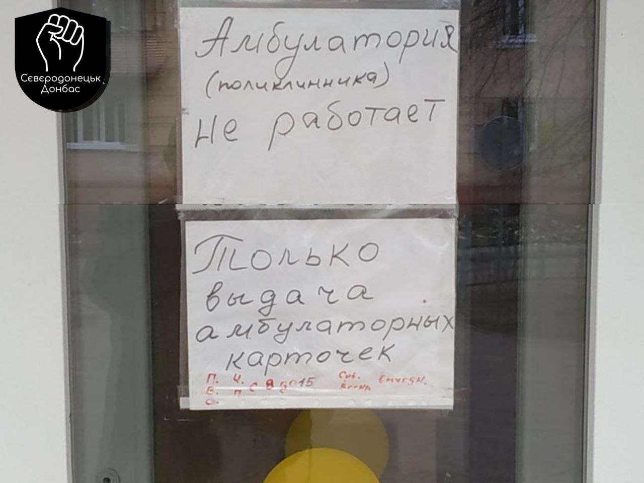 Амбулаторія №2 в окупованому Сєвєродонецьку на Луганщині припинила роботу – замість отримання медичних послуг тут тепер можна лише забрати власну картку. Відповідні фото розмістив Телеграм-канал "Сєвєродонецьк. Донбас" 18 березня.