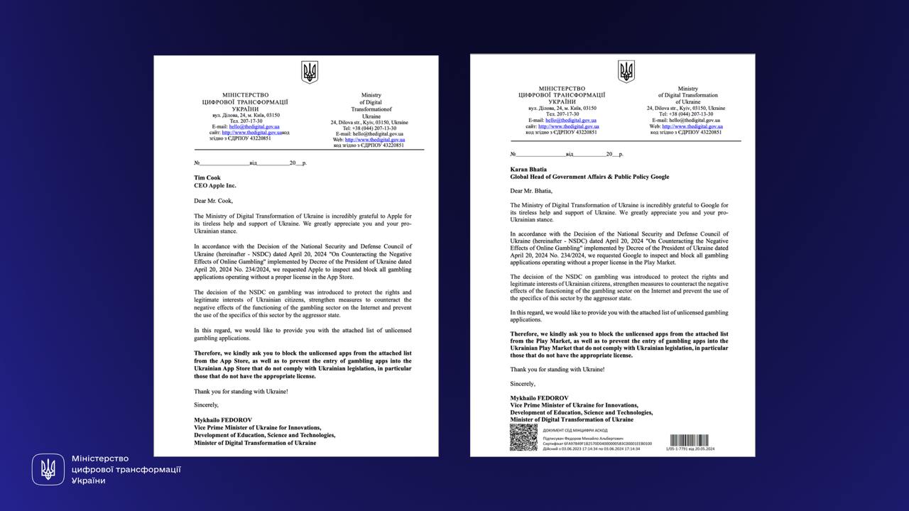 "Раніше за ініціативою Президента щодо обмеження азартних ігор звернулися до Apple та Google. Сьогодні отримали перші рішення — в App Store заблоковано 50 застосунків азартних ігор. Також налаштували фаст-трек з Apple щодо блокування. Усі застосунки, які виявлятиме та передаватиме наша команда, — будуть одразу блокуватися. Якщо маєте такі кейси — повідомляйте нам. Для цього пишіть на пошту [email protected] з темою листа «Блокування казино»", - написав він.