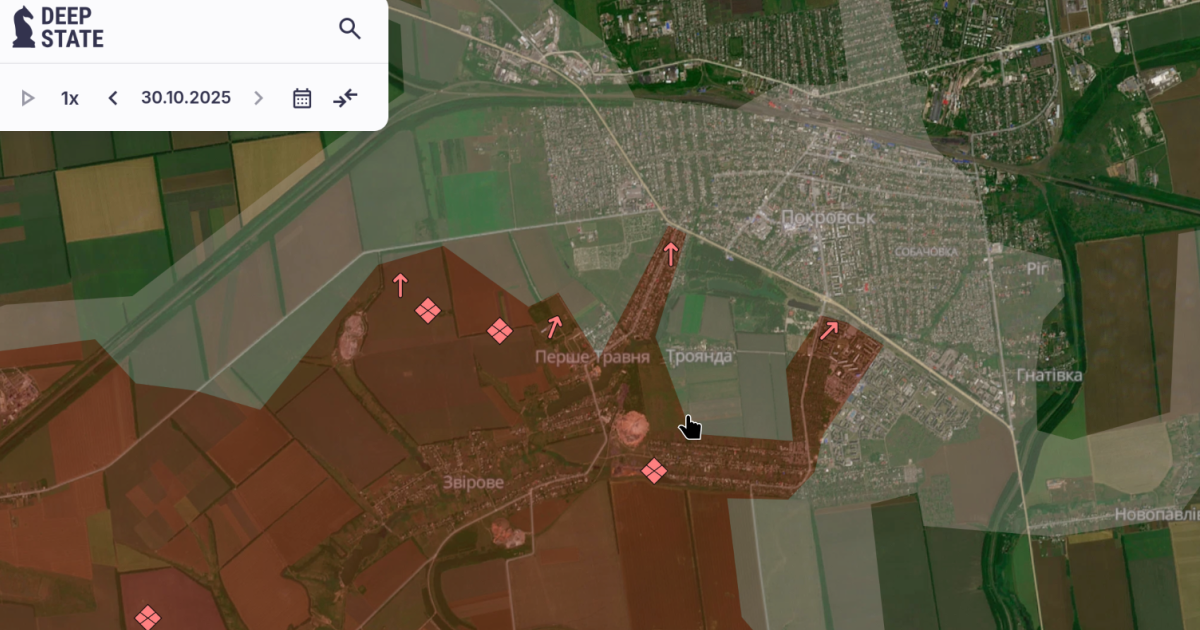 "Російські окупанти просунулися протягом минулої доби в міських кварталах Покровська (Донецька обл.), а також в Успенівці, Новомиколаївці та Новогригорівці Пологівського району (Запорізька обл.)", - повідомляє 31 жовтня "Інтерфакс.Україна" з посиланням на DeepState. Згідно з мапами OSINT-аналітиків, на покровському напрямку площа під контролем ворога за добу збільшилася на 0,42 кв км, а "сіра зона" невизначеного контролю – на 7,85 кв км. У Запорізькій області за минулу добу окупантам вдалося просунутися на 5,16 кв км, а "сіра зона" невизначеного контролю скоротилася на 1,47 кв км. Загалом, площа території під контролем ворога зросла за добу на 5,58 кв км. Як повідомлялося, 30 жовтня Головнокомандувач ЗСУ Олександр Сирський заявив, що Добропільська операція триває, а заяви російської пропаганди - брехня.