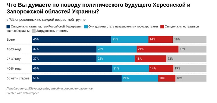 Менше половини росіян (45%) підтримують можливу анексію РФ Херсонської та Запорізької областей України. Про це свідчать результати опитування Леваду-центру.