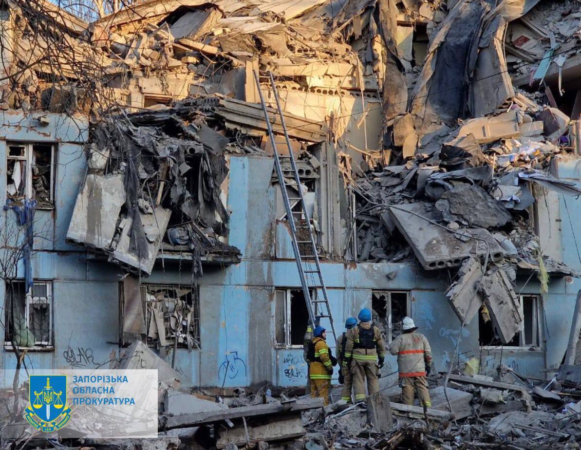 Число загиблих внаслідок ракетного удару рашистів по житловому будинку в Запоріжжі вночі 2 березня збільшилося до чотирьох людей, ще п'ять зникли безвісти, серед них дитина. Про це повідомив у Телеграм Офіс генпрокурора.