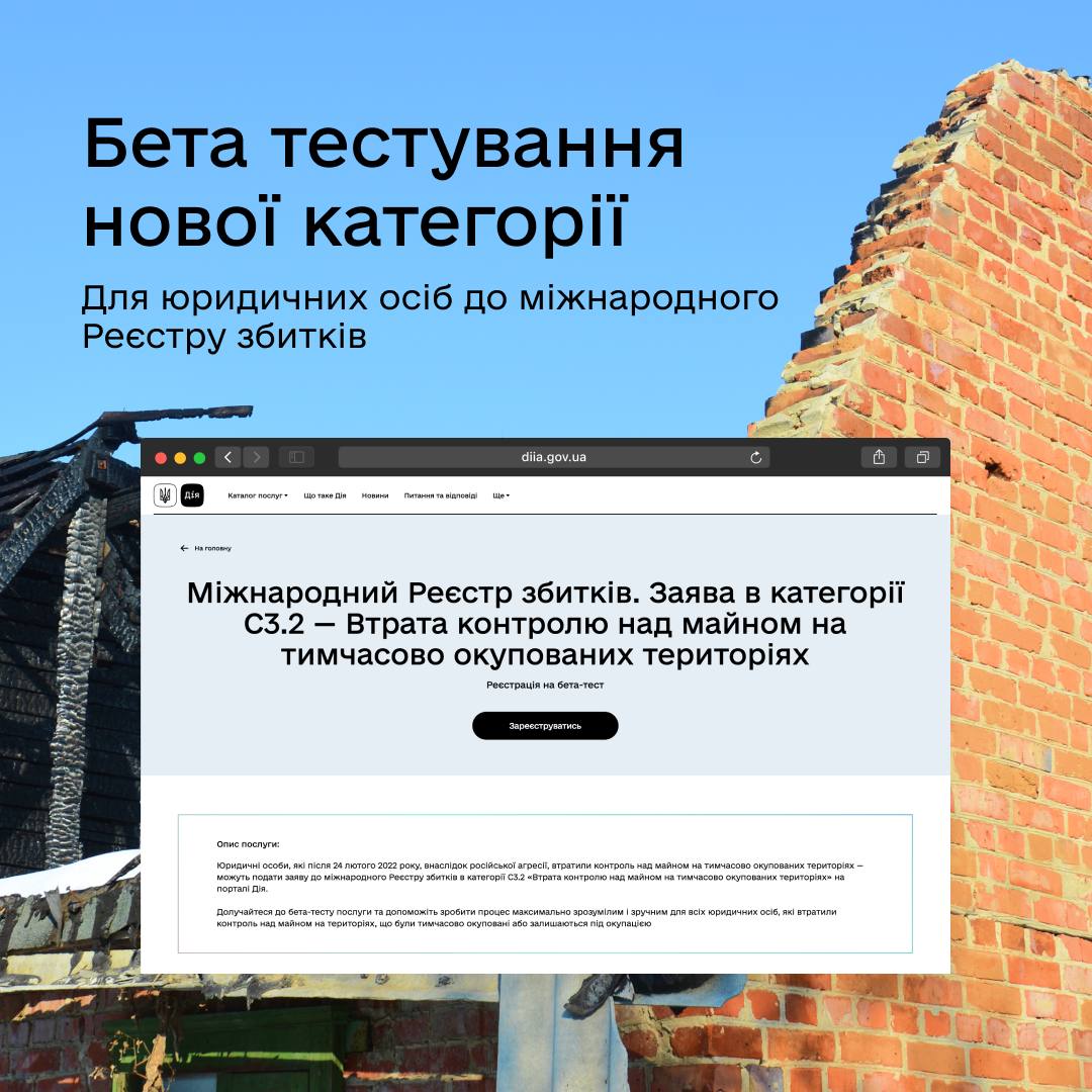 "Запускаємо запис на бета-тестування послуги C3.2 — «Втрата контролю над майном на тимчасово окупованих територіях». Якщо юридична особа втратила контроль над своїм майном через окупацію після 24 лютого 2022 року, це можна офіційно зафіксувати на міжнародному рівні" - повідомляє 4 березня Телеграм-канал "Дія".