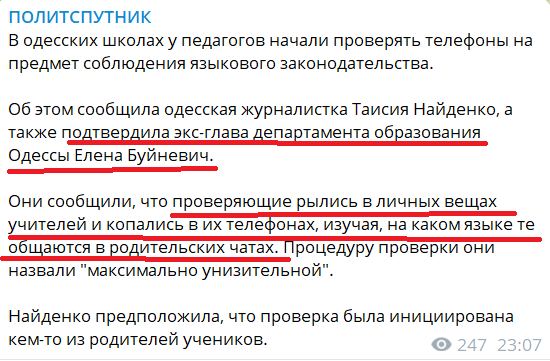 «Українські соцмережі вже добу обговорюють якісь жорсткі перевірки одеських вчителів щодо дотримання… мовного законодавства. Там обшуки, копання в телефонах та інший треш», — пише один із Z-блогерів.