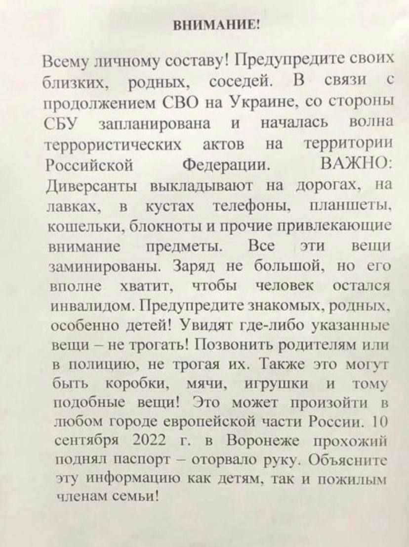"Військкомати на території РФ розповсюджують "пам’ятки" для місцевих жителів, у яких звинувачують українські спецслужби в плануванні та проведенні терористичних актів проти мирного населення, – йдеться в повідомленні. – Начебто "диверсанти" викладають на дорогах, лавках і в кущах заміновані телефони, гаманці, планшети. І що подібним чином можуть бути заміновані навіть дитячі речі".