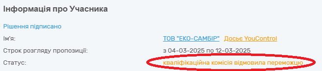 Станом на вечір 10 березня на майданчику електронних торгів gov.e-tender.ua з'явилася інформація, що «кваліфікаційна комісія відмовила переможцю».