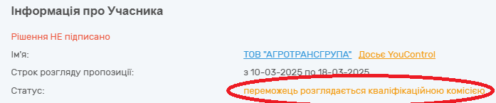 Остаточне рішення щодо закупівлі мало бути ухвалене після розгляду переможця кваліфікаційною комісією.