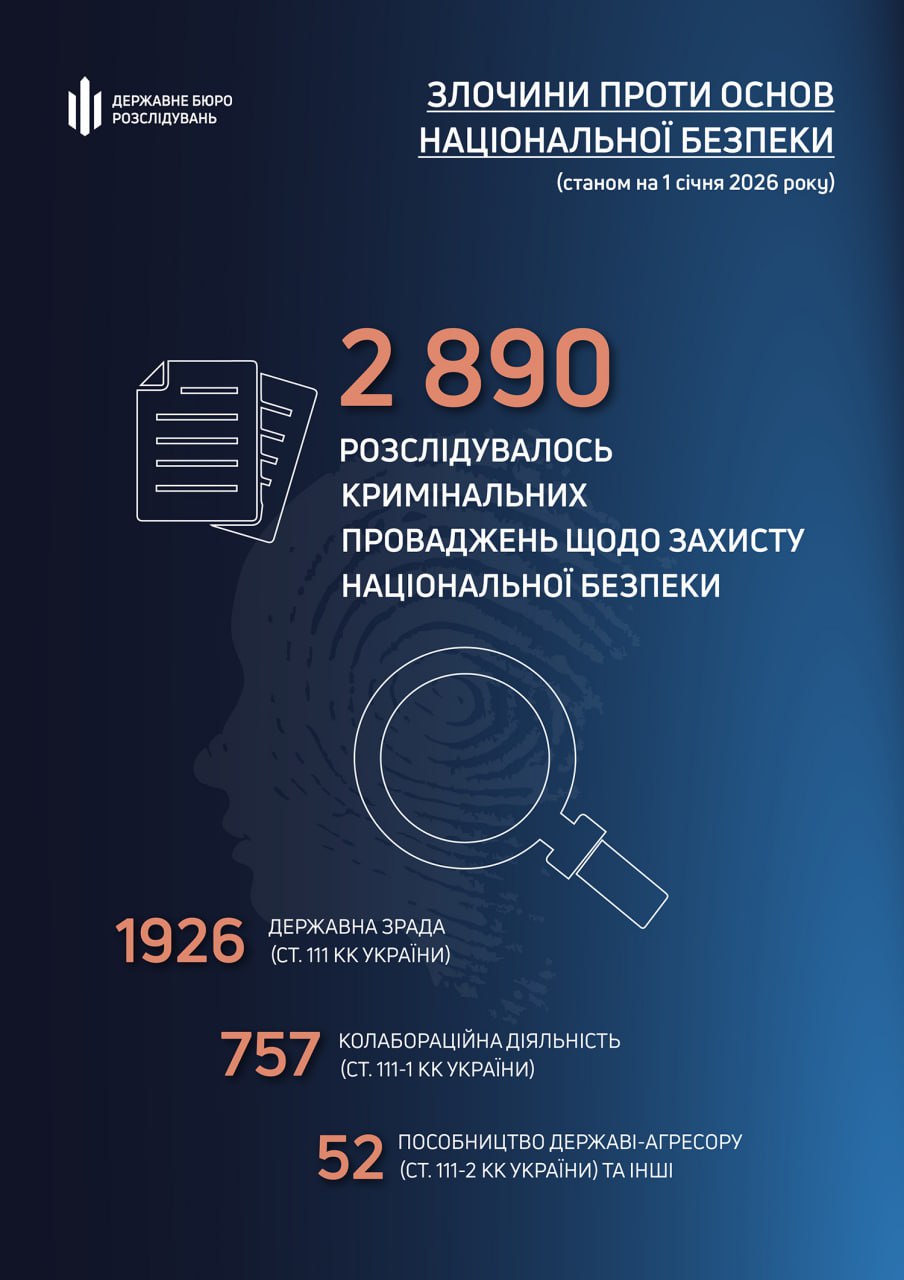 "Державне бюро розслідувань системно викриває осіб, які зрадили Україну або співпрацюють із ворогом під час війни. Слідчі ДБР збирають докази, допитують свідків і передають матеріали до суду, щоб кожен винний був притягнутий до відповідальності. З початку повномасштабного вторгнення росії Бюро розслідує 2 тис. 890 кримінальних проваджень щодо злочинів проти національної безпеки держави", - повідомили в Телеграм-каналі відомства 6 січня.