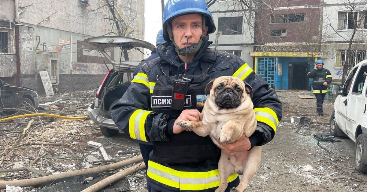 Маленького мопса врятували у Запоріжжі після ворожої ракетної атаки 22 березня. Про це повідомила ДСНС України на своїй сторінці у Facebook.