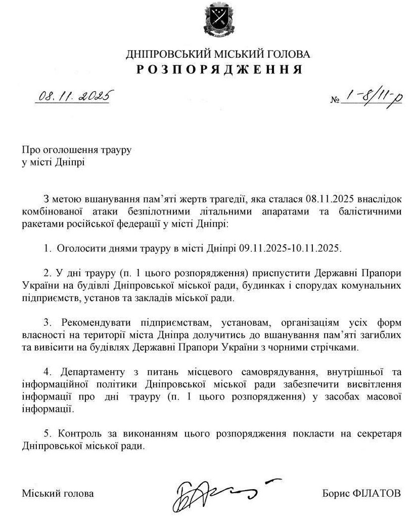 "Завтра та післязавтра за загиблими у Дніпрі оголошено жалобу", - повідомив у Телеграм вдень 8 листопада мер Дніпра Борис Філатов.