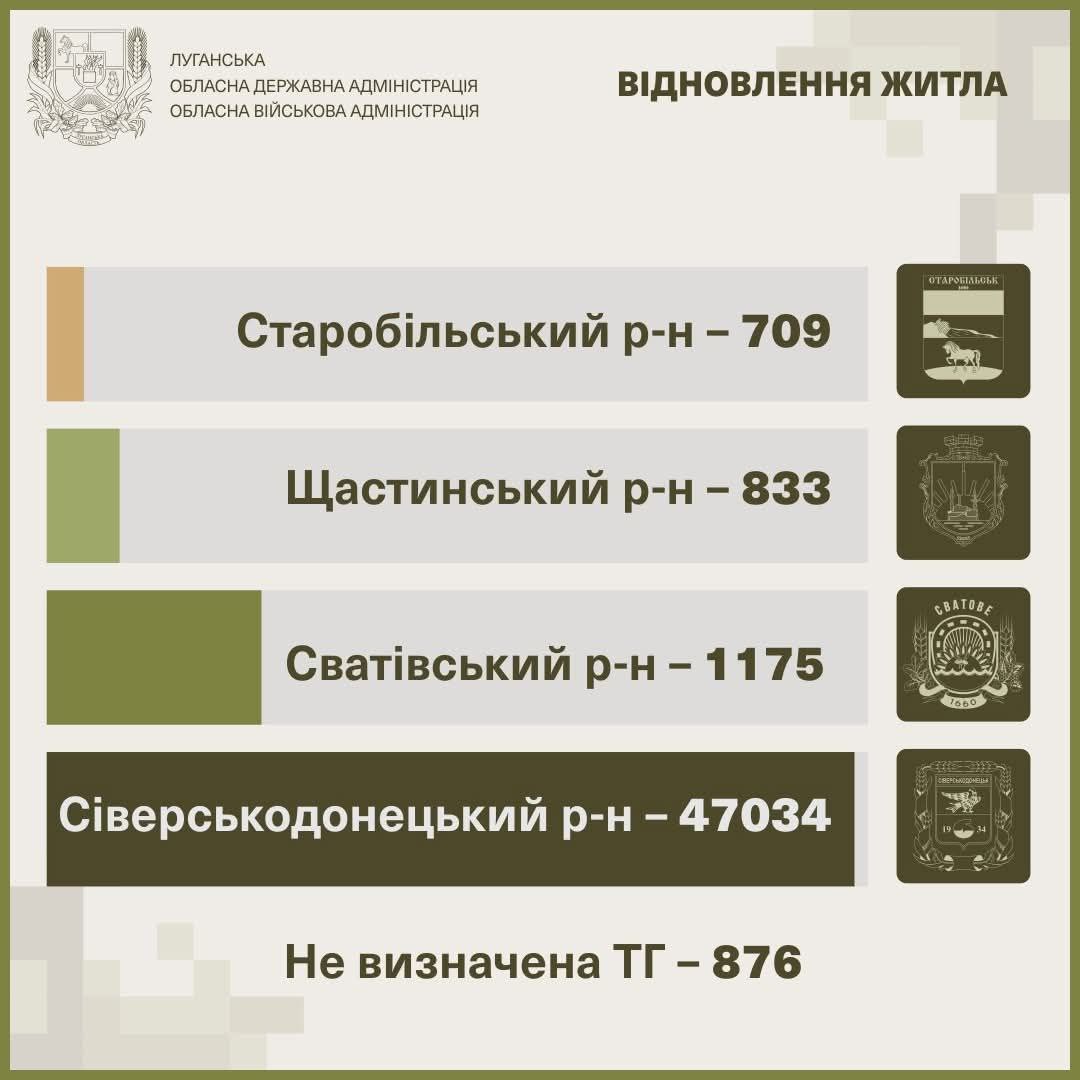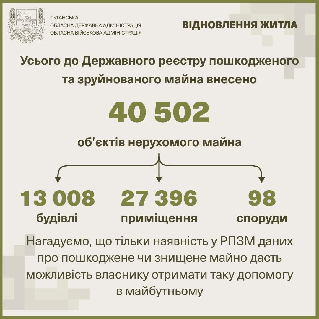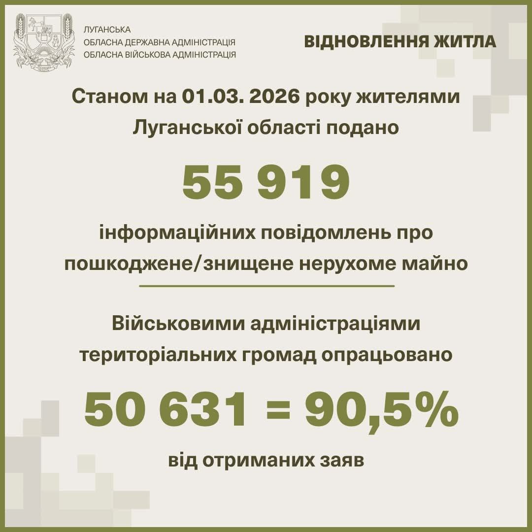 "Наразі жителями області подано 55 919 інформаційних повідомлень про пошкоджене/знищене нерухоме майно. Зокрема, упродовж лютого надійшло 400 таких повідомлень", - повідомила Луганська ОВА у соцмережах 4 березня.