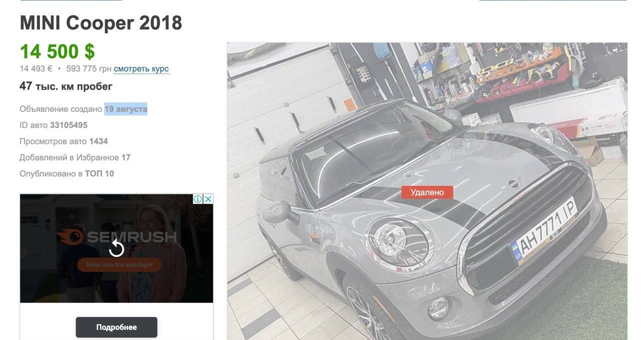 Mini Cooper, на якому нібито їздила призначена ФСБ "вбивця" Дар'ї Дугіної у Москві у цей час продавався в Україні. Про це свідчить оголошення на одному із рекламних майданчиків в Інтернеті. Продавець просив за нього 594 тисячі гривень.