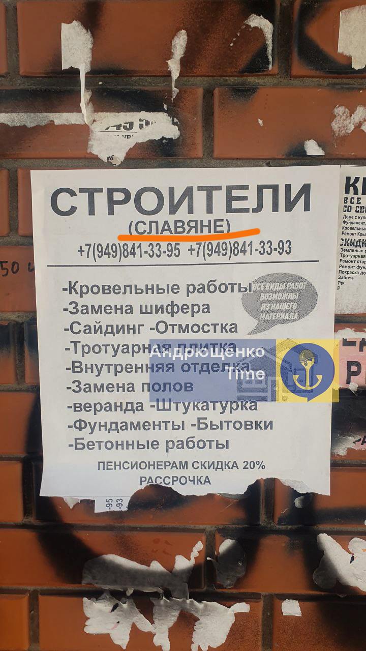 В окупованому Маріуполі з'явилися оголошення з пропозицією виконати різні будівельні роботи. Окремо обмовляється, що всі працівники будуть слов'янами