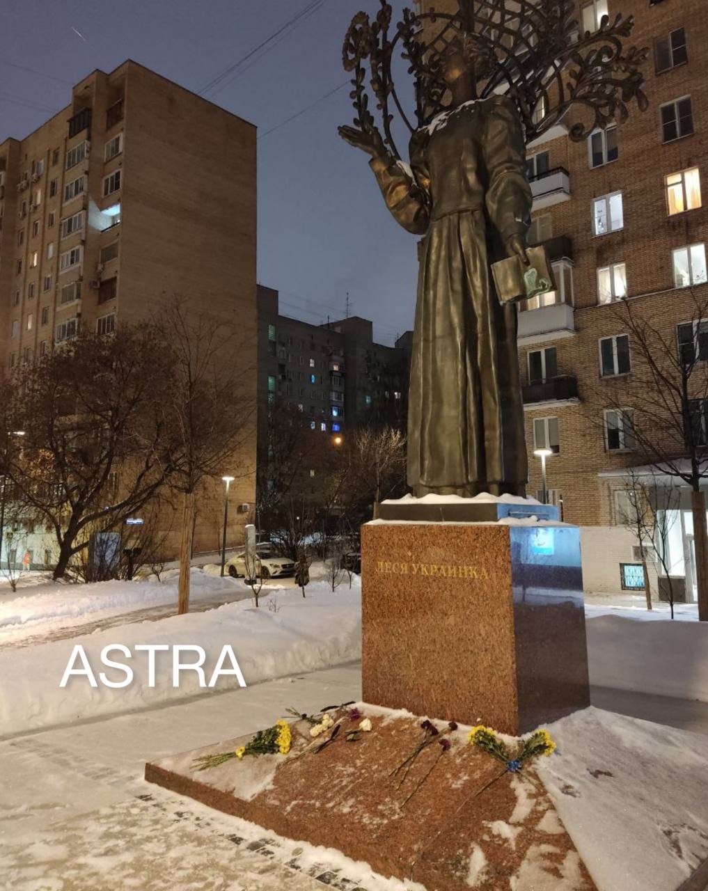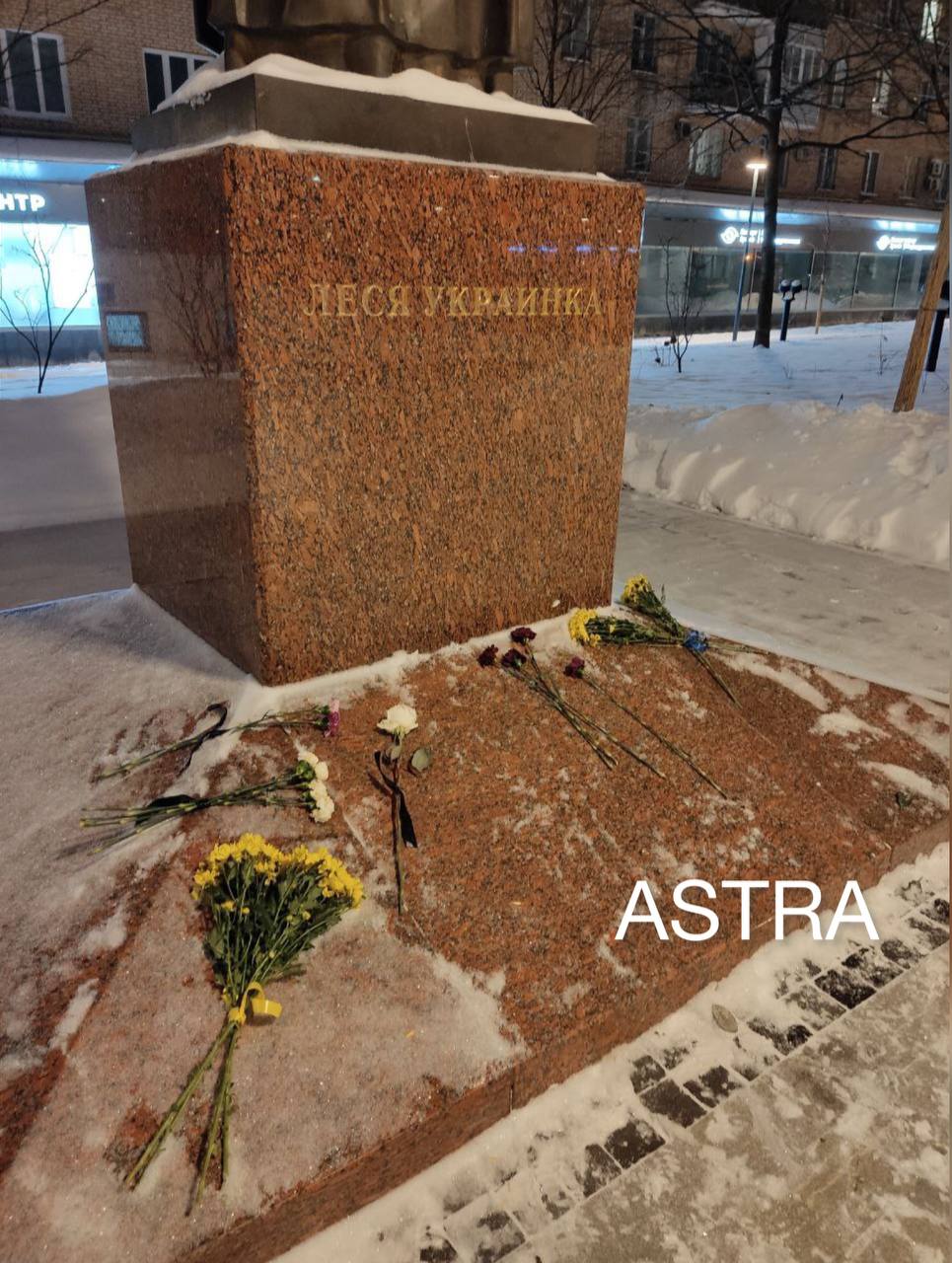 Москвичі несуть квіти до пам'ятника Лесі Українки в пам'ять про річницю масового вбивства російською ракетою мирних мешканців житлового будинку в Дніпрі