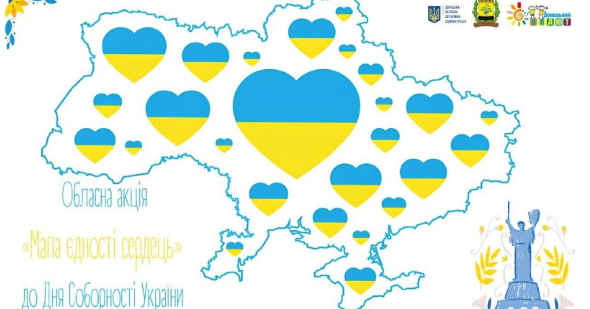 "Донецький обласний палац дитячої та юнацької творчості урочисто запрошує дітей, молодь, родини та творчі колективи Донеччини долучитися до обласної акції до Дня Соборності України «Мапа єдності сердець» — символу неподільності України, спільних цінностей та незламної сили нашого єднання"", - повідомляє Донецька ОВА 5 січня.