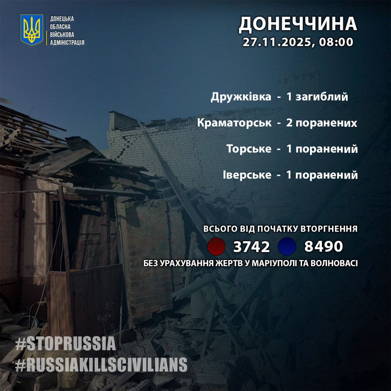 "За 26 листопада росіяни вбили 1 жителя Донеччини — у Дружківці. Ще 4 людини в області за добу дістали поранення", - повідомив вранці, 27 листопада, керівник Донецької ОВА Вадим Філашкін.