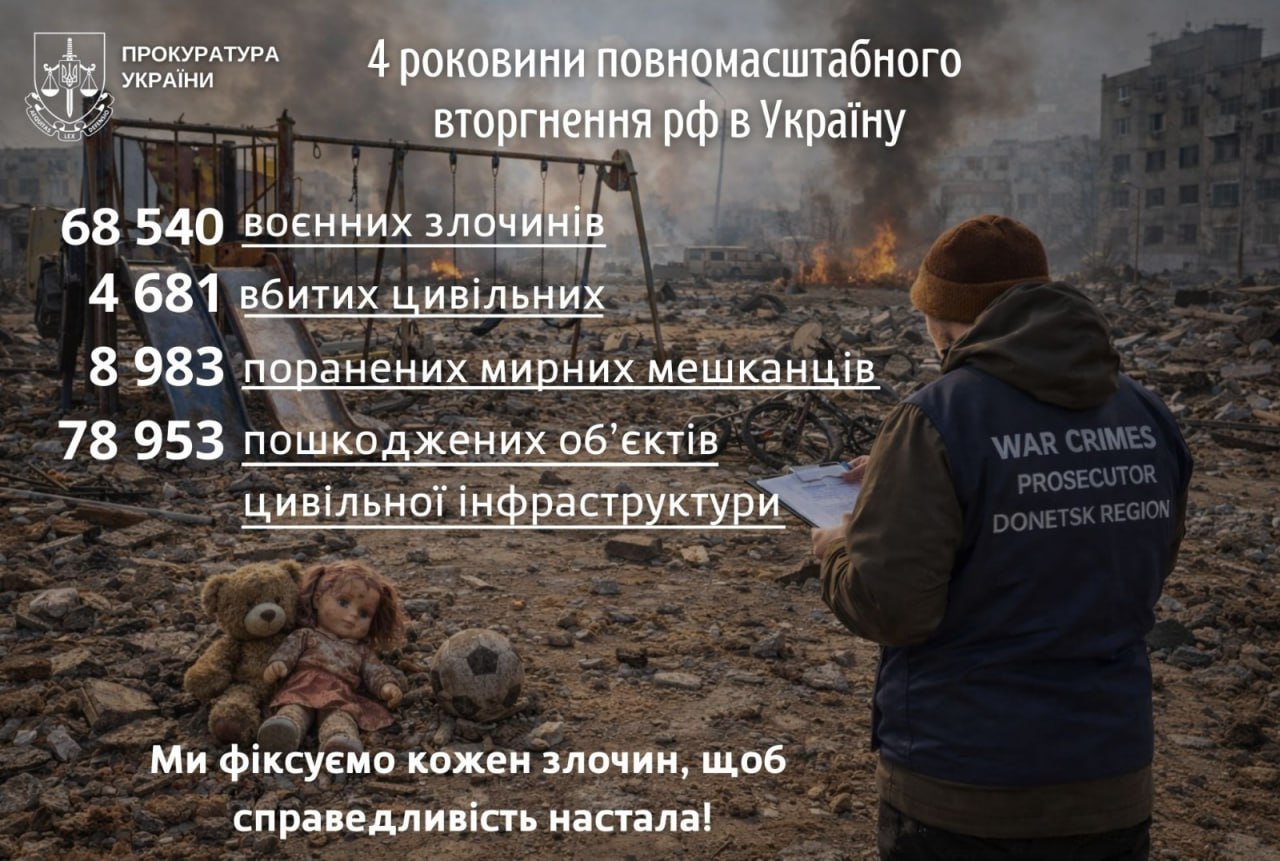 "З початку повномасштабного вторгнення прокурори Донецької обласної прокуратури задокументували 68 540 фактів вчинення воєнних злочинів. Станом на сьогодні ворог забрав життя 4 681 цивільних осіб та поранив 8 983 мирних мешканців", - повідомляє. прокуратура Донецької області 24 лютого.