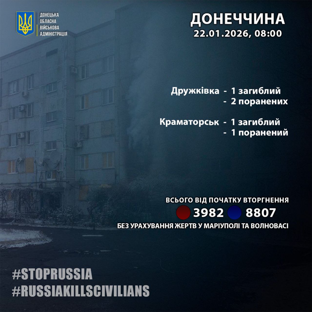 "За 21 січня росіяни вбили 2 жителів Донеччини: у Дружківці та Краматорську", - повідомив очільник Донецькеої ОВА Вадим Філашкін.