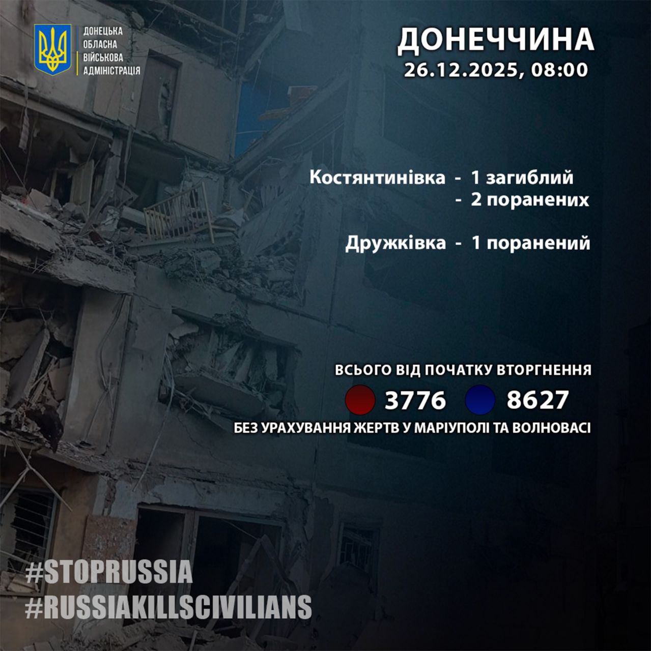 За 25 грудня росіяни вбили 1 жителя Донеччини — у Костянтинівці. Ще 3 людини в області за добу дістали поранення", - повідомив очільник Донецької ОВА Вадим Філашкін.