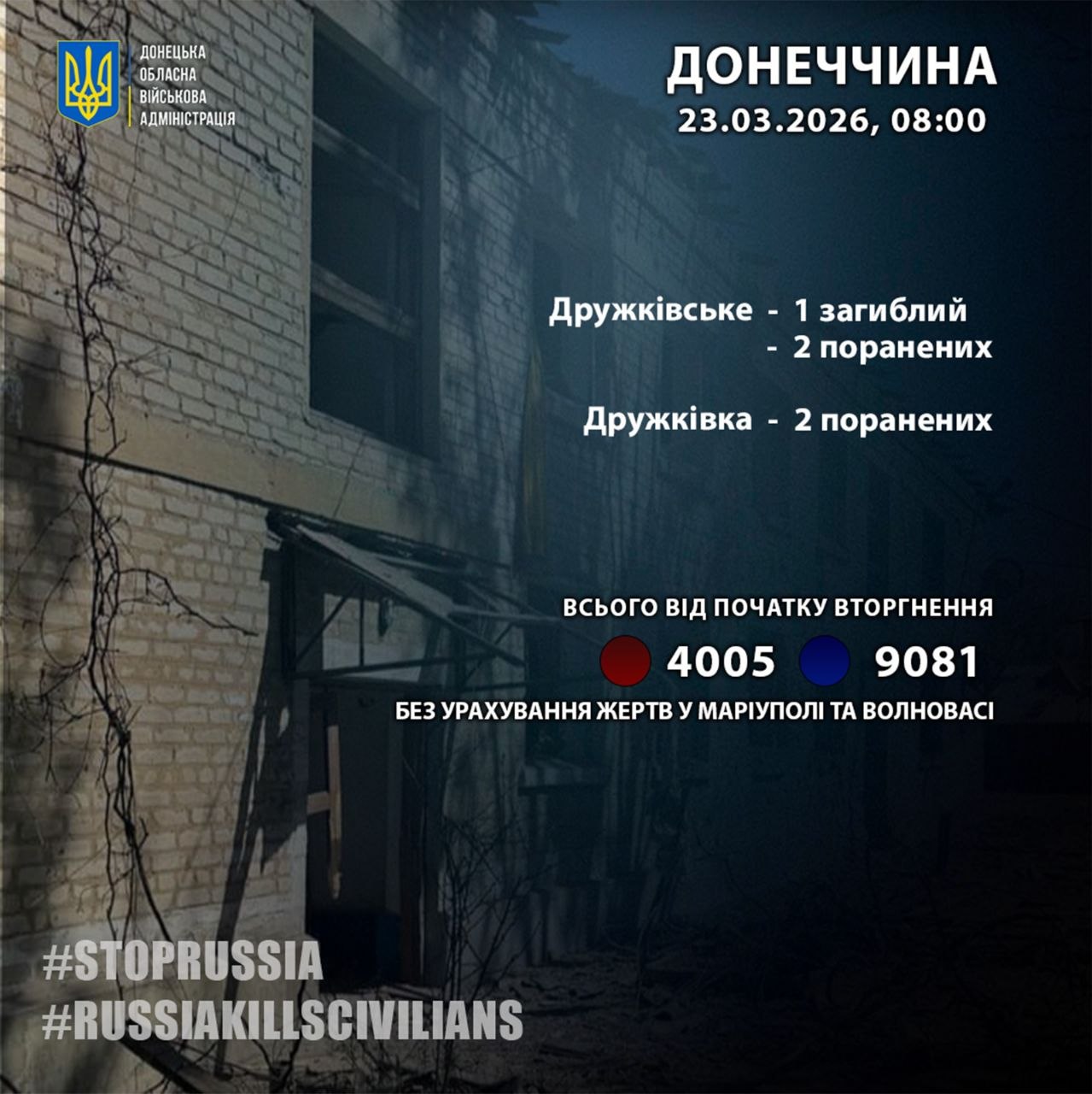 "За 22 березня росіяни вбили 1 жителя Донеччини: у Дружківському. Ще 4 людини в області за добу дістали поранення", - повідомив очільник Донецької ОВА Вадим Філашкін.