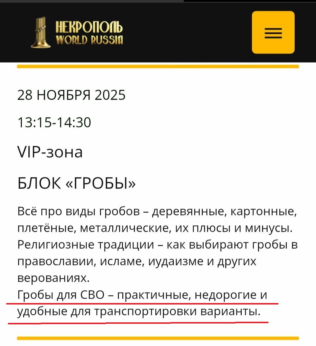 Стенд «Труни для СВО – практичні, недорогі та зручні для транспортування варіанти» буде представлений 28 листопада в Москві у VIP-залі Міжнародної виставки-форуму «НЕКРОПОЛЬ – WORLD RUSSIA 2025» . Про це йдеться в діловій програмі виставки.
