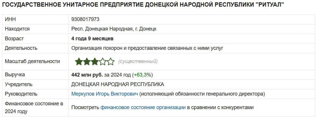 Йдеться про ГУП «Ритуал» — похоронне агентство, яке фактично має монополію на всі ритуальні послуги в окупації. Саме ця структура щороку приносить окупаційній владі та своїм керівникам із рф сотні мільйонів рублів прибутку, а її стрімке зростання напряму пов’язане з війною.