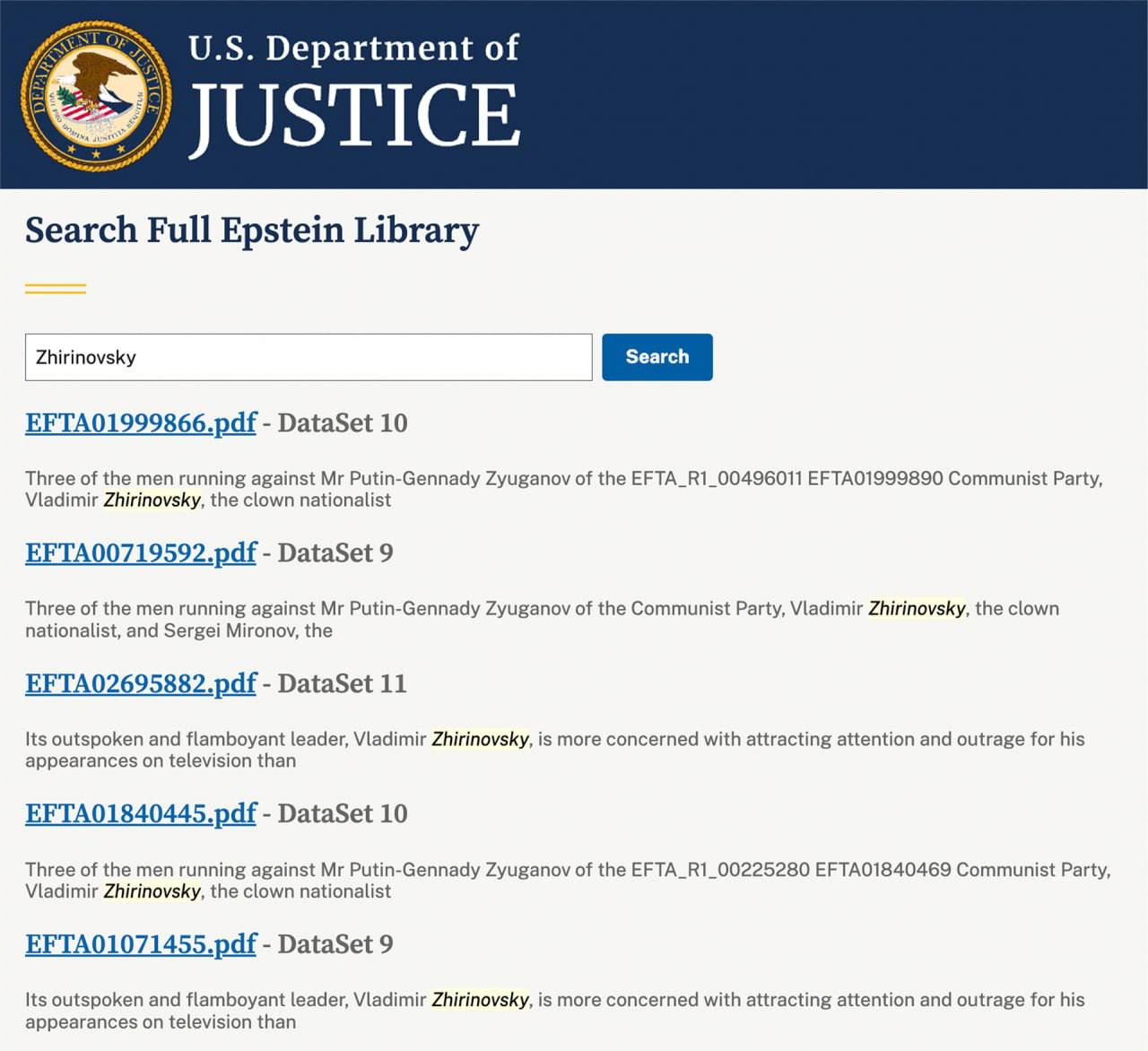 Ім'я російського одіозного політика Володимира Жириновського згадується в скандальних файлах п'ять разів. Епштейн називав Жириновського «клоуном-націоналістом, який любить цілувати і торкатися хлопчиків».