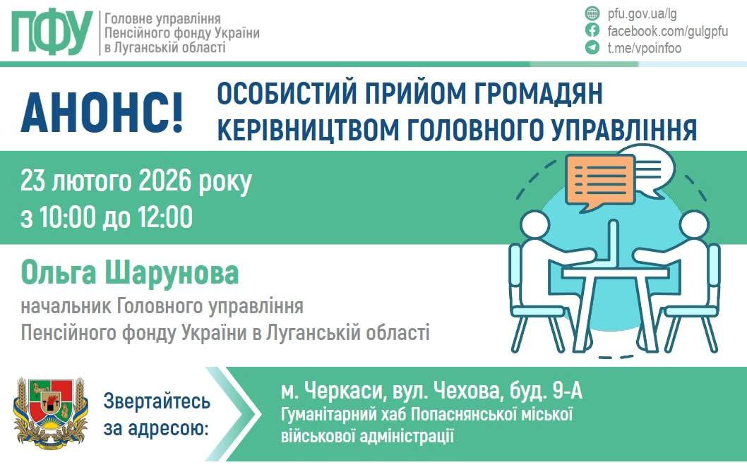 "23 лютого у хабі Попаснянської громади відбудеться особистий прийом начальника Головного управління Пенсійного фонду України в Луганській області Ольги Шарунової", - повідомила Луганська ОВА в соцмережах 18 лютого.