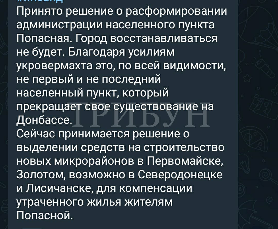 "Принято решение о расформировании администрации населенного пункта Попасная, – йдеться в повідомленні окупантів. – Город восстанавливаться не будет".
