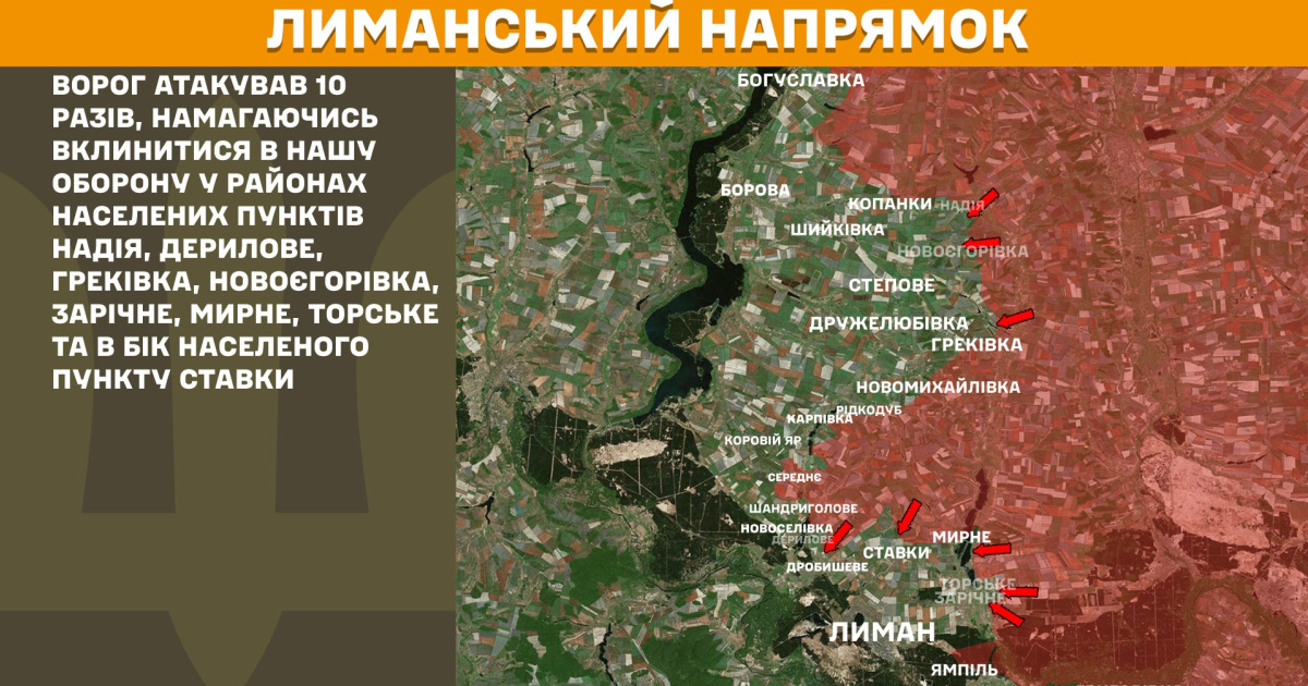 Як ідеться в оперативній інформації Генштабу ЗСУ станом на 8:00 4 декабря, на Лиманському напрямку ворог атакував 10 разів, намагаючись вклинитися в нашу оборону у районах населених пунктів Надія, Дерилове, Греківка, Новоєгорівка, Зарічне, Мирне, Торське та в бік населеного пункту Ставки.