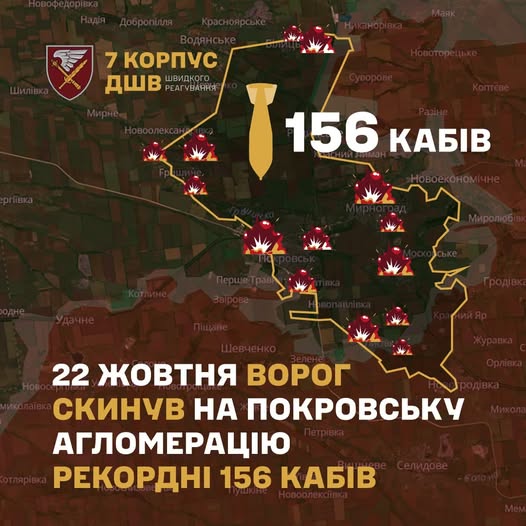 <p style="text-align: justify;">"Ворог стирає авіабомбами Покровську агломерацію. Вчора, 22 жовтня, у смузі відповідальності 7 корпусу ШР ДШВ росіяни завдали тактичною авіацією рекордні 39 ударів, скинувши загалом 156 керованих авіабомб. Це – найвищий показник авіаударів у нашій смузі оборони з липня 2025 року", - <a href="/news/okupanty-prodovzhuyut-infiltratsiyu-v-lisah-v-trykutnyku-naselenyh-punktiv-yampil-lyman-zarichne-i536997" target="_blank" rel="noopener">повідомляє</a> 7 корпус швидкого реагування Десантно-штурмових військ ЗСУ.</p> <p style="text-align: justify;">Як повідомляється, ворог скинув КАБи переважно по півночі Покровська, району населеного пункту Гришине та Мирноград, а також – в районі лінії розмежування біля села Лисівка.</p> <div class="article__content__img"><img class="" title="" src="/upload/media/2025/10/23/571048239-122149993544863217-6318800707003615648-n.jpg" alt="" /></div> <p style="text-align: justify;">"Загалом з початку жовтня ворог атакував Покровську агломерацію тактичною авіацією 215 разів, скинувши 860 КАБів по 250 кг кожна. Тактична мета таких атак – зруйнувати нашу логістику. Стратегічна – разом із постійними спробами інфільтрації, тиску з флангів та з нарощенням кількості відкритих штурмів зламати оборону Покровська", - зазначили військові.</p> <p style="text-align: justify;">Нагадаємо, окупанти <a href="/news/okupanty-prodovzhuyut-infiltratsiyu-v-lisah-v-trykutnyku-naselenyh-punktiv-yampil-lyman-zarichne-i536997" target="_blank" rel="noopener">продовжують інфільтрацію в лісах в трикутнику населених пунктів Ямпіль-Лиман-Зарічне. </a></p>