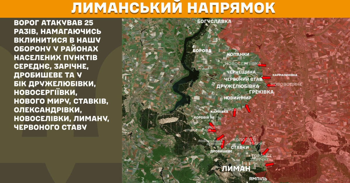Як ідеться в оперативній інформації Генштабу ЗСУ станом на 8:00 13 грудня, на Лиманському напрямку ворог атакував 25 разів, намагаючись вклинитися в нашу оборону у районах населених пунктів Середнє, Зарічне, Дробишеве та у бік Дружелюбівки, Новосергіївки, Нового Миру, Ставків, Олександрівки, Новоселівки, Лиману, Червоного Ставу.