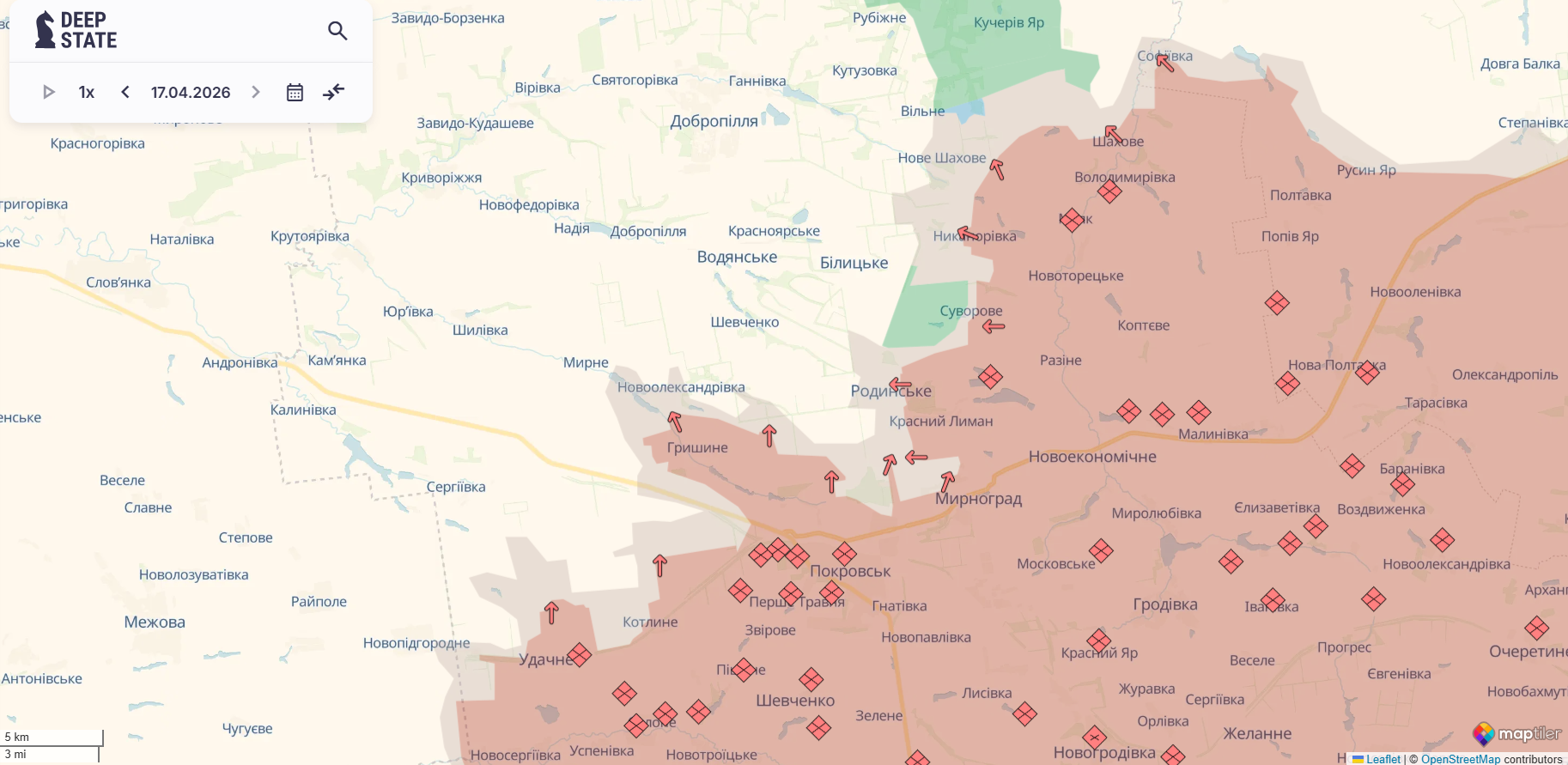"Мапу оновлено. Ворог просунувся у Родинському та Червоному Лимані", - повідомляє аналітичний проект DeepState 17 квітня.