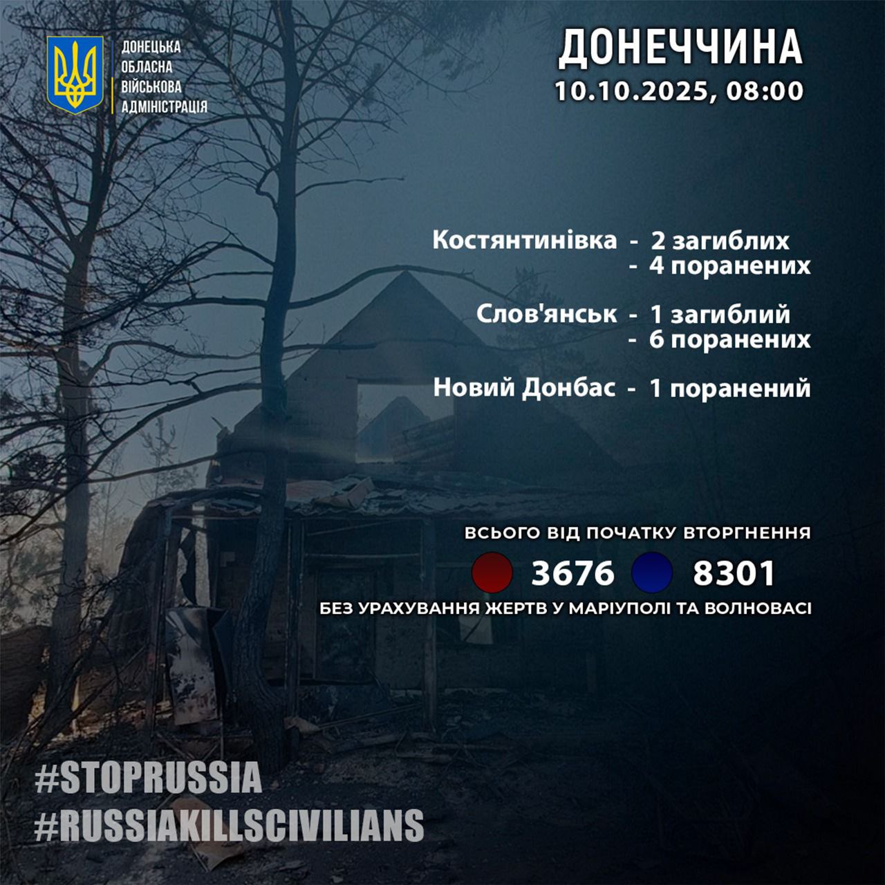 <p style="text-align: justify;">"За 9 жовтня росіяни вбили 3 жителів Донеччини: 2 у Костянтинівці і 1 у Слов'янську", - повідомив керівник Донецької ОВА Вадим Філашкін 10 жовтня.</p> <p style="text-align: justify;">Ще 11 людей в області за добу дістали поранення.</p> <div class="article__content__img"><img src="/upload/media/2025/10/10/photo-2025-10-10-07-59-02.jpg" alt="" /></div>
