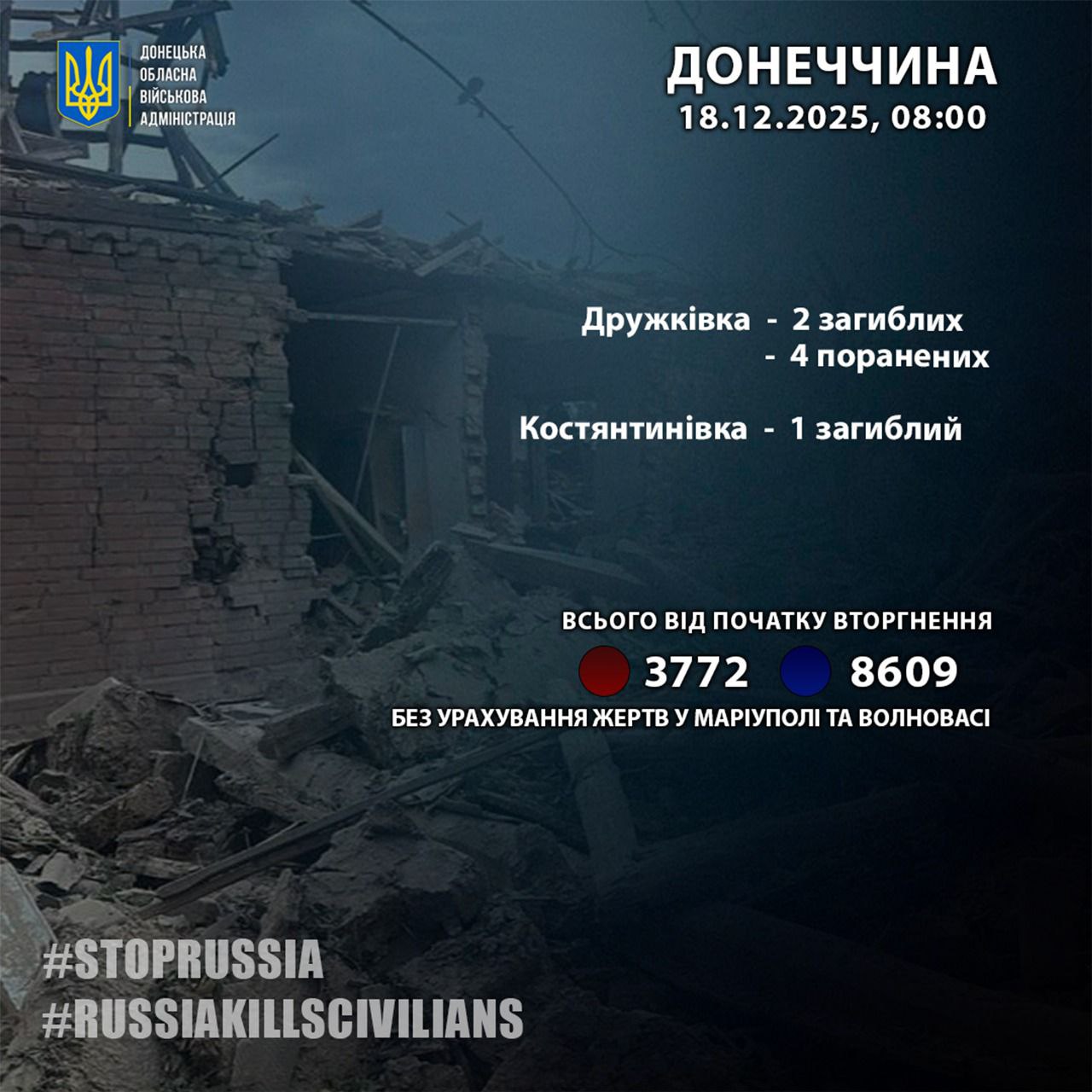 "За 17 грудня росіяни вбили 3 жителів Донеччини: 2 у Дружківці та 1 у Костянтинівці. Ще 4 людини в області за добу дістали поранення", - повідомив керівник Донецької ОВА Вадим Філашкін 18 грудня.