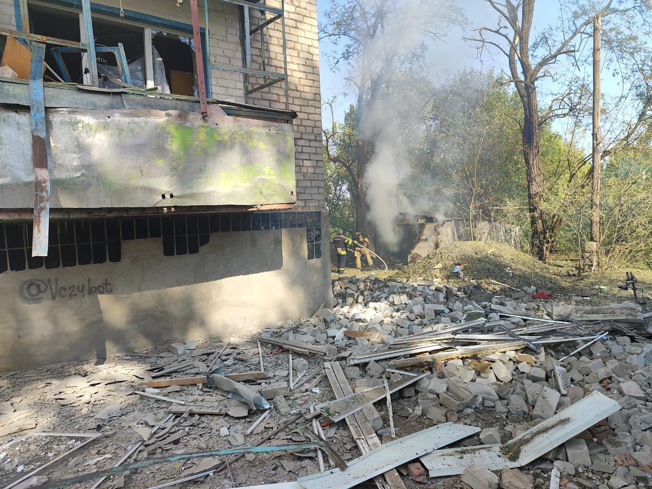 "Краматорський район. У Зарічному Лиманської громади зруйновано 2 будинки. У Костянтинівці поранено 5 людей, пошкоджено 7 багатоповерхівок, 10 торгових павільйонів, крамницю, адмінбудівлю, 4 автівки, лінію електропередач і газогін", зазначив очільник ОВА.