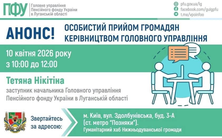 "10 квітня у столичному хабі Нижньодуванської громади відбудеться особистий прийом заступника начальника Головного управління Пенсійного фонду України в Луганській області Тетяни Нікітіної", - повідомила Луганська ОВА в соцмережах 9 квітня.