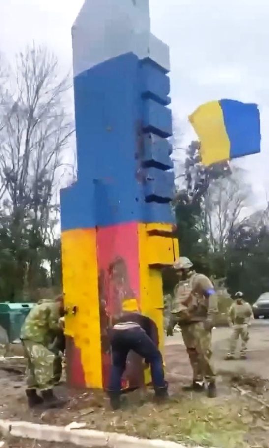 "Громадські роботи від ЗСУ. Військовополонених росіян залучили до відновлення стели в Куп'янську. Солдати РФ перефарбували знак на в'їзді до міста з триколору у синьо-жовті кольори", - йдеться у повідомленні.