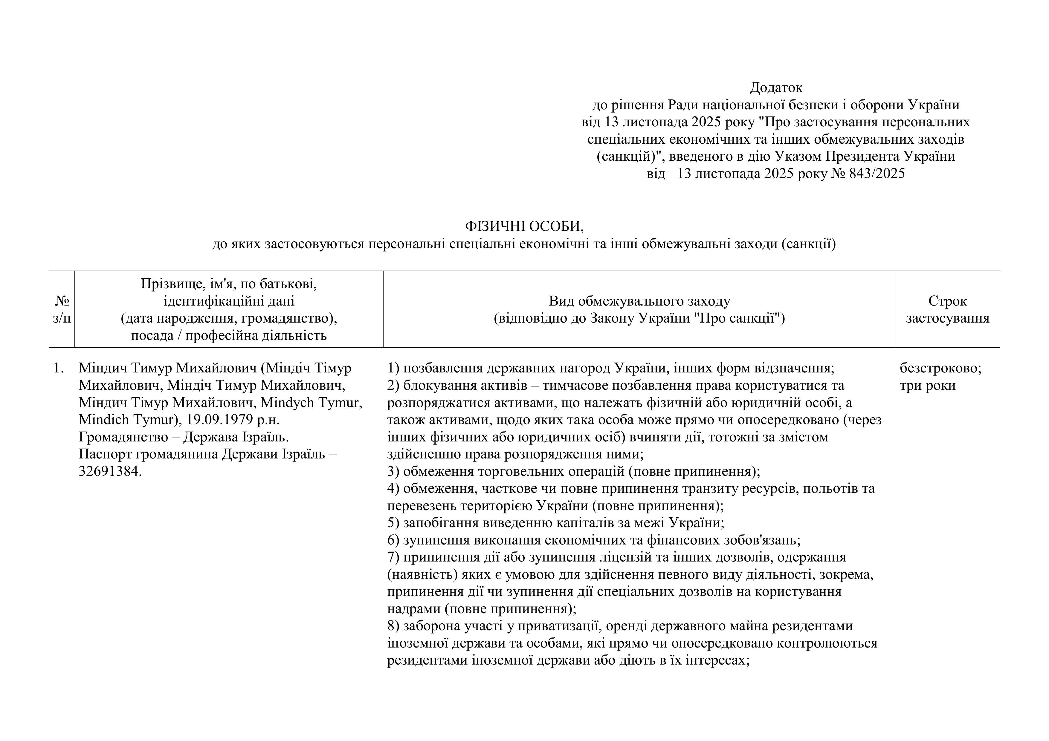 Президент України Володимир Зеленський 13 листопада підписав Указ №843/2025 "Про рішення Ради національної безпеки і оборони України від 13 листопада 2025 року "Про застосування персональних спеціальних економічних та інших обмежувальних заходів (санкцій)".