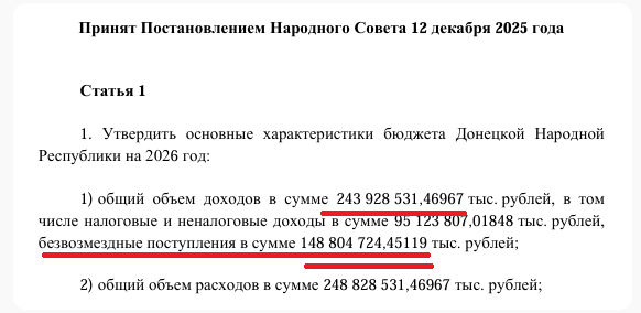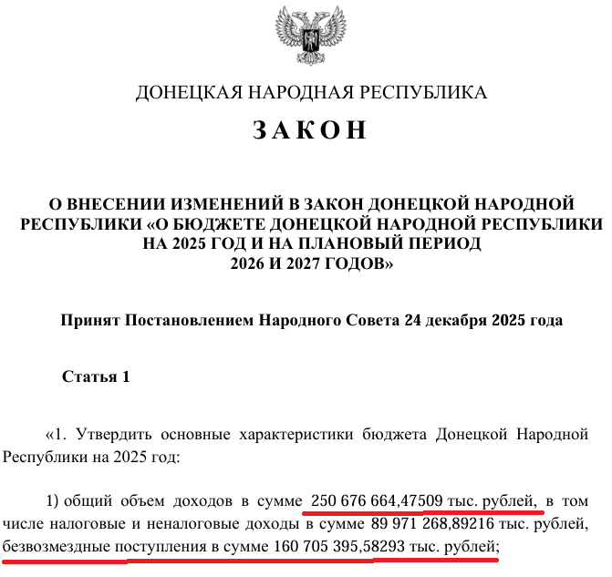 При цьому Чертков не згадав, що доходи бюджету «ДНР» 2025 року на 64% складалися з безоплатних надходжень, тобто дотацій, з бюджету РФ.