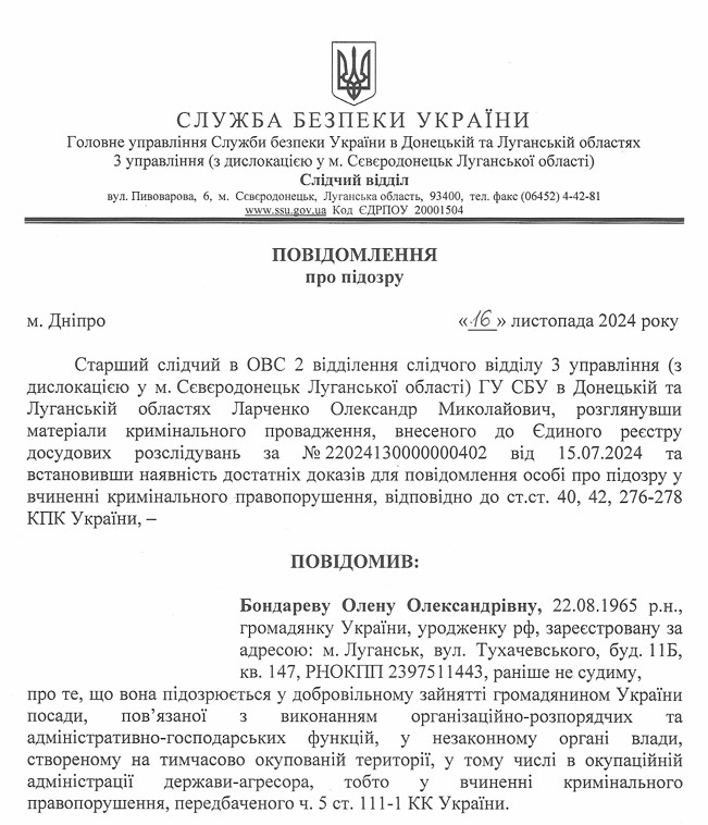 <p style="text-align: justify;">СБУ повідомила про підозру колаборантці Олені Бондаревій, яка співпрацює з ворогом на посаді "заступниці міністра фінансів ЛНР" на окупованій території Луганської області. Про це повідомило 3 управління ГУ СБУ в Донецькій та Луганській областях в м. Сіверськодонецьк у <a href="https://www.facebook.com/ssu.sievierodonetsk/posts/pfbid02E1iWLQLdeVNHMFgvnS2Fp5FsimNFg62wQfpuYWL7r4wDpC4TD5t81D8eBFcjNLbl?__cft__[0]=AZXVg1u6I9TiRPPgB3D73fLGkQTGKeM4A2q6eif11EBh6c5hQDxjFlLJ-g75e9cRWan5Rx6bWeVJ6oRsKanP5cYX1mDrFRXFbjW3TxcW3SloDsE_OuKXyKhSi3QAgQjx7RPVP6uMaH508s8WU7cBiwGLWnOo5SYJkV_xRkD6kavV1jzp4UoNFZ8cRyrj7WjOVAc&__tn__=%2CO%2CP-R" target="_blank" rel="noopener">facebook</a> 19 листопада. </p> <p style="text-align: justify;">"СБУ зібрала докази колабораційної діяльності мешканки Луганська, яка від початку російської агресії допомагає рашистам реалізовувати "бюджетну політику" угруповання "ЛНР". Задокументовано, що після 2014 року чиновниця працевлаштувалась в окупаційному "міністерстві фінансів ЛНР", отримавши "портфель" "заступника міністра - директора департаменту витрат", - сказано в повідомленні.</p> <p style="text-align: justify;">Судячи з інформації з публічного простору та від джерел "ОстроВа", йдеться про Олену Бондареву. </p> <div class="article__content__img"><img style="display: block; margin-left: auto; margin-right: auto;" src="/upload/media/2024/11/19/f-02.jpg" alt="" /> <div class="article__content__img"><img style="display: block; margin-left: auto; margin-right: auto;" src="/upload/media/2024/11/19/f-03.jpg" alt="" /></div> </div> <p style="text-align: justify;">Після широкомасштабного вторгнення зрадниця підтвердила свій вибір на користь агресора, вступивши в "Єдину росію". </p> <p style="text-align: justify;">У березні 2023 року, в рамках "інтеграції" окупованої території до системи управління РФ, колаборантку було перепризначено на ту ж саму керівну посаду в окупаційному "мінфіні". Наразі вона продовжує виконувати керівні функції у створеному загарбниками "міністерстві" та забезпечувати фінансування окупаційного режиму на Луганщині.</p> <p style="text-align: justify;">Фігурантці повідомлено про підозру за ч. 5 ст. 111-1 Кримінального кодексу України (колабораційна діяльність). Санкція статті передбачає до 10 років позбавлення волі та конфіскацію майна. </p> <p style="text-align: justify;">Раніше повідомлялось, що <a href="/news/do-8-rokiv-tyurmy-zaochno-zasudyly-kolaboranta-z-popasnoyi-jogo-ogolosheno-v-rozshuk-i498841" target="_blank" rel="noopener">до 8 років тюрми заочно засудили колаборанта з Попасної Миколу Чернікова, його оголошено в розшук</a>.</p>