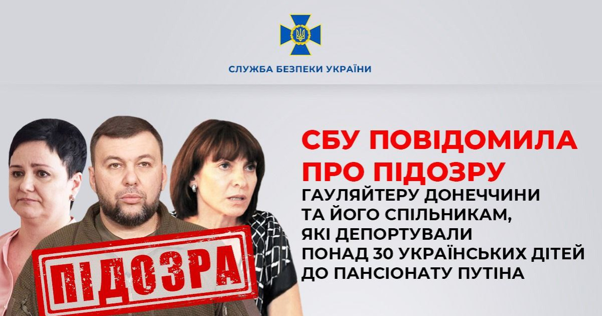Гауляйтеру окупованої території Донецької області Денису Пушиліну і двом його спільникам СБУ повідомила про підозру за депортацію понад 30 українських дітей до пансіонату в Московську область. Про це повідомили в Телеграм-каналі СБУ 1 жовтня.