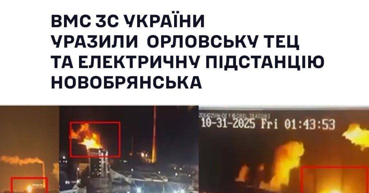 <p style="text-align: justify;">"Підрозділи ВМС ЗС України нанесли влучний ракетний удар крилатими ракетами "Нептун" по Орловській ТЕЦ та електричній підстанції Новобрянська", - повідомили в Телеграм-каналі ВМС ЗСУ 31 жовтня. </p> <p style="text-align: justify;">Зазначається, що обидва об’єкти забезпечували живленням військові підприємства регіону, тому виведення їх з ладу - серйозний удар по логістиці окупантів.</p> <p style="text-align: justify;">Раніше <a href="/news/gur-zavdyaky-ukrayinskym-dronam-pererobka-naftoproduktiv-v-rf-skorotylas-pryblyzno-na-20-tse-duzhe-i537787" target="_blank" rel="noopener">в ГУР повідомили, що завдяки українським дронам переробка нафтопродуктів в РФ скоротилась приблизно на 20%: це дуже високі цифри.</a></p>